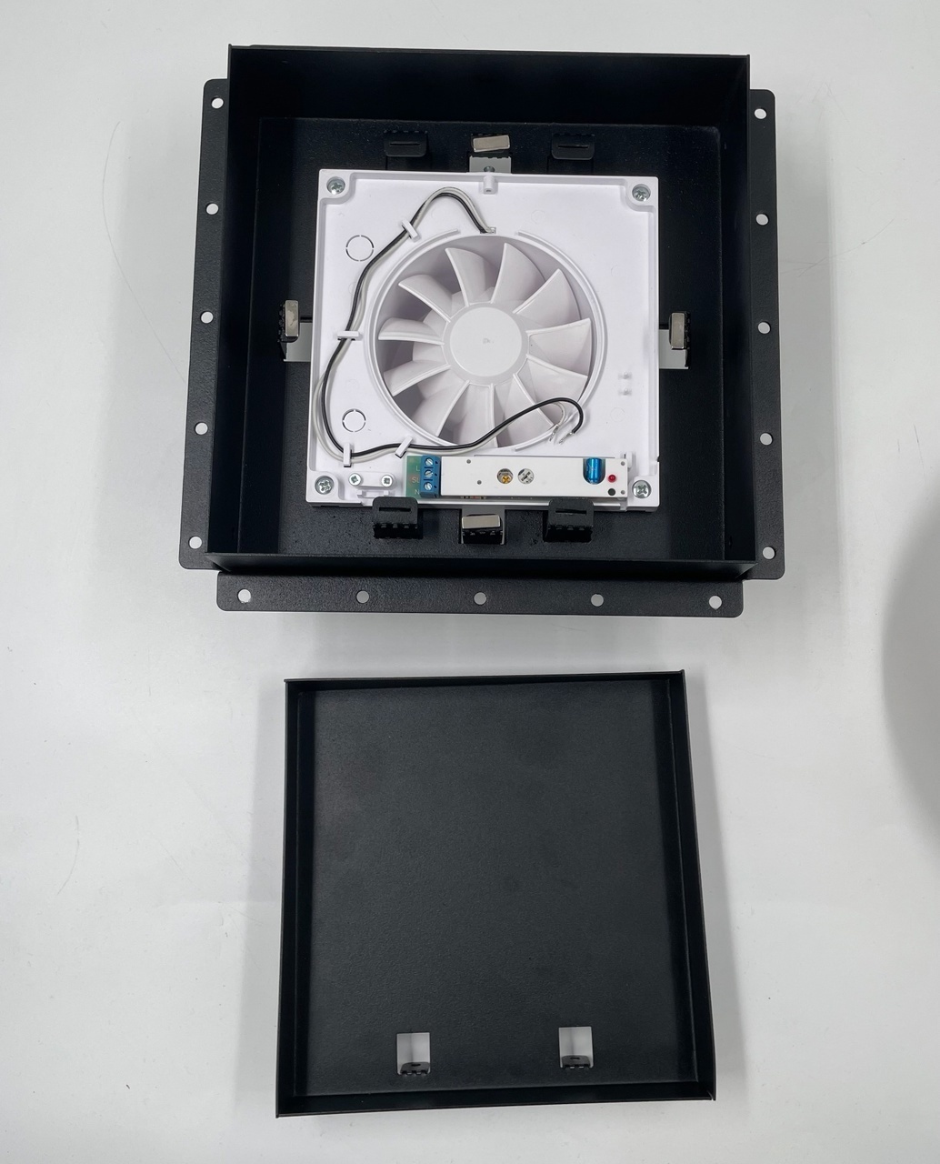 Решетка скрытого монтажа FoZa ПОД ПЛИТКУ 237х237 с вентилятором на шарикоподшипнике 125СК, обратный клапан, черная, d125мм
